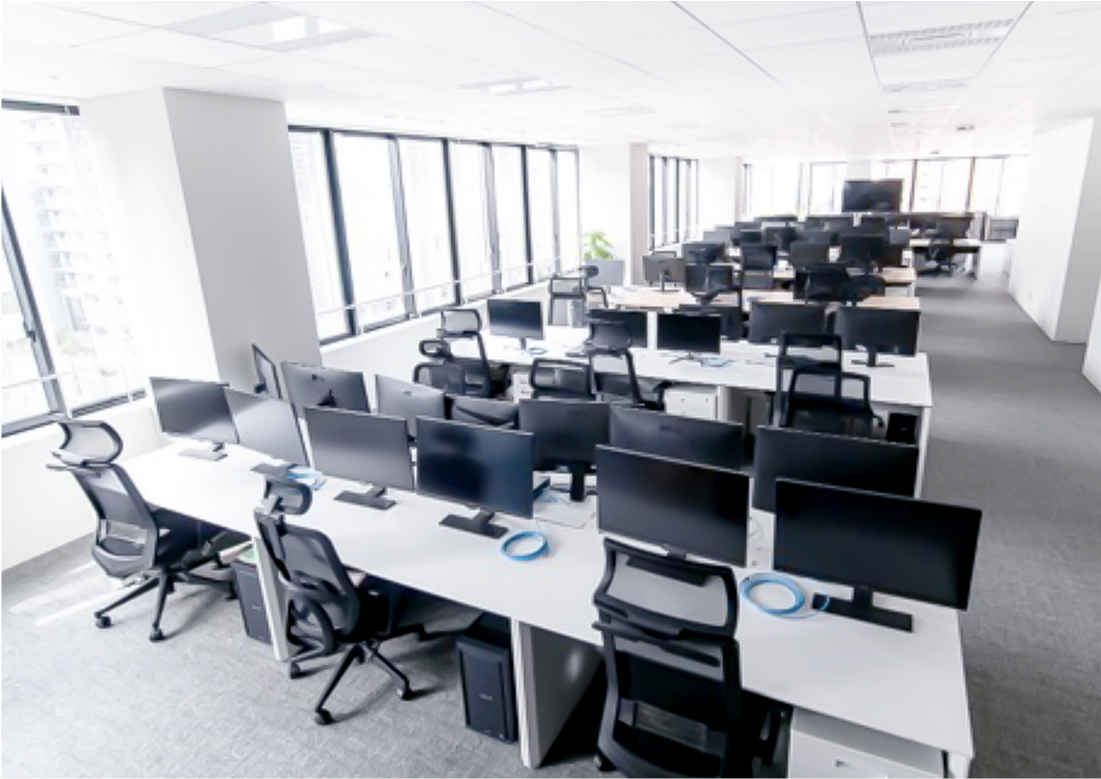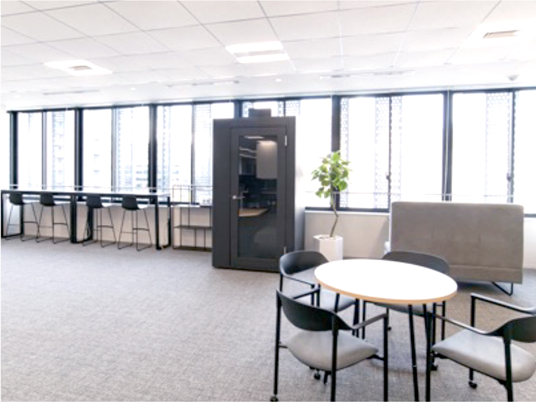 大型モニターと無線の画面共有でスムーズなミーティングをサポート。専用スピーカーでWeb会議も快適です。Wi-Fi・有線LANも完備し、安定した通信環境を提供します。さらに、周囲の音を遮断する個別集中ブースも用意。集中して作業やWeb会議に取り組める、多様なワークスタイルに対応した環境です。
