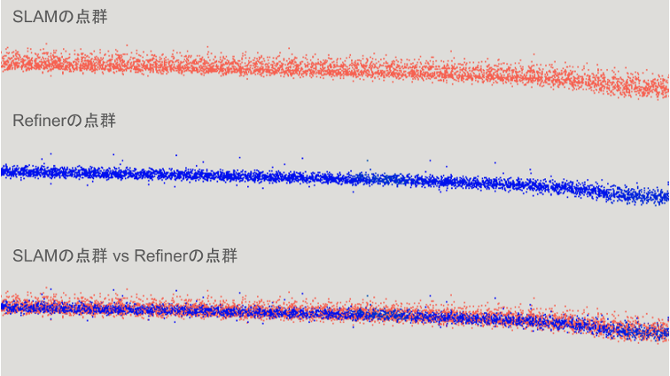 - 軌跡高精度化: Pose Refinerにより、振動や誤差による点群のブレ(厚み)を抑え、よりシャープで正確な3次元地図の作成を実現します。